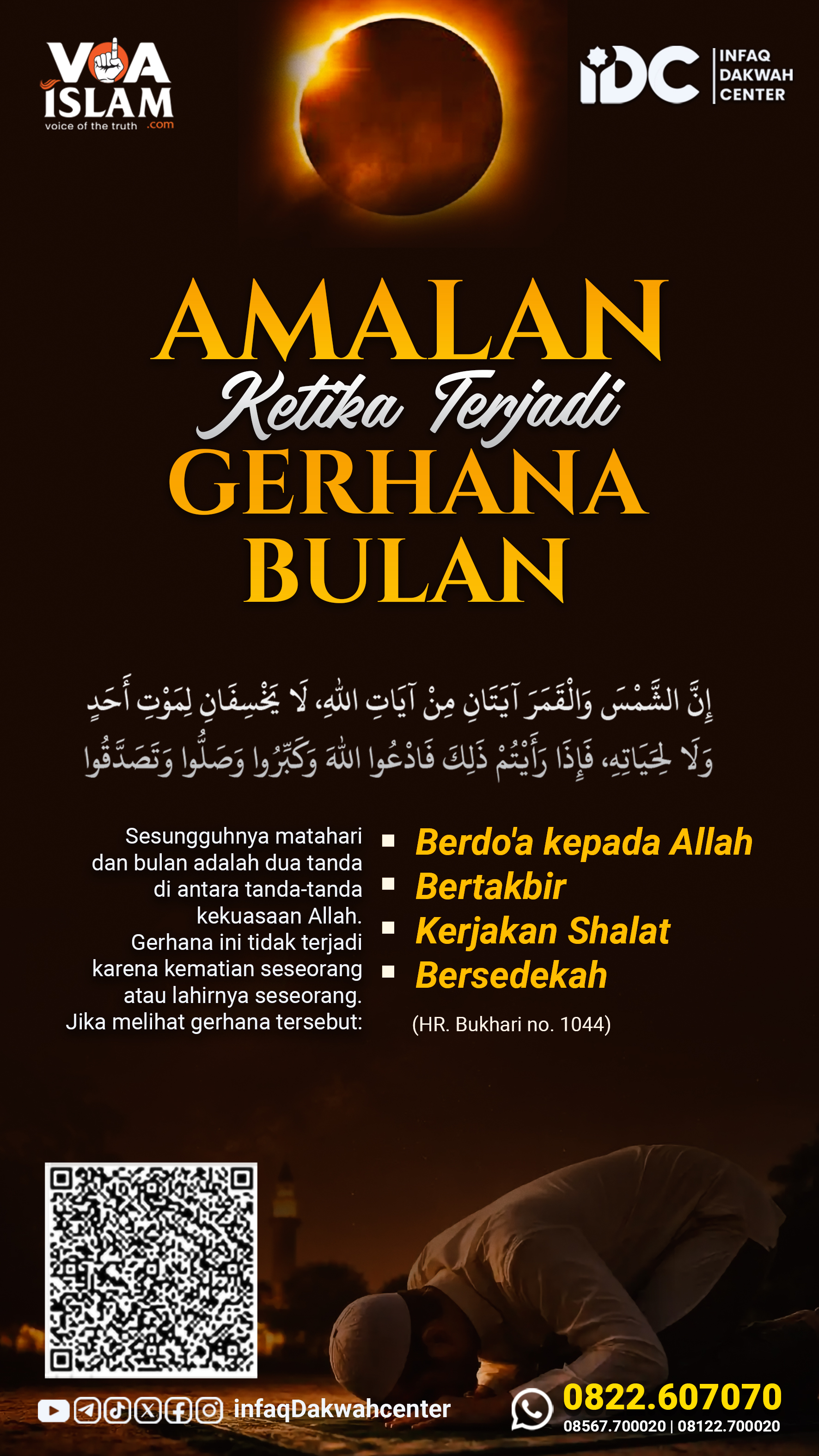 “Sesungguhnya matahari dan bulan adalah dua tanda di antara tanda-tanda kebesaran Allah. Keduanya tidak mengalami gerhana karena kematian seseorang dan tidak pula karena hidupnya seseorang. Maka jika kalian melihatnya bersegeralah berdoa kepada Allah dan shalat sehingga kembali terang” (Muttafaq ‘alaih)