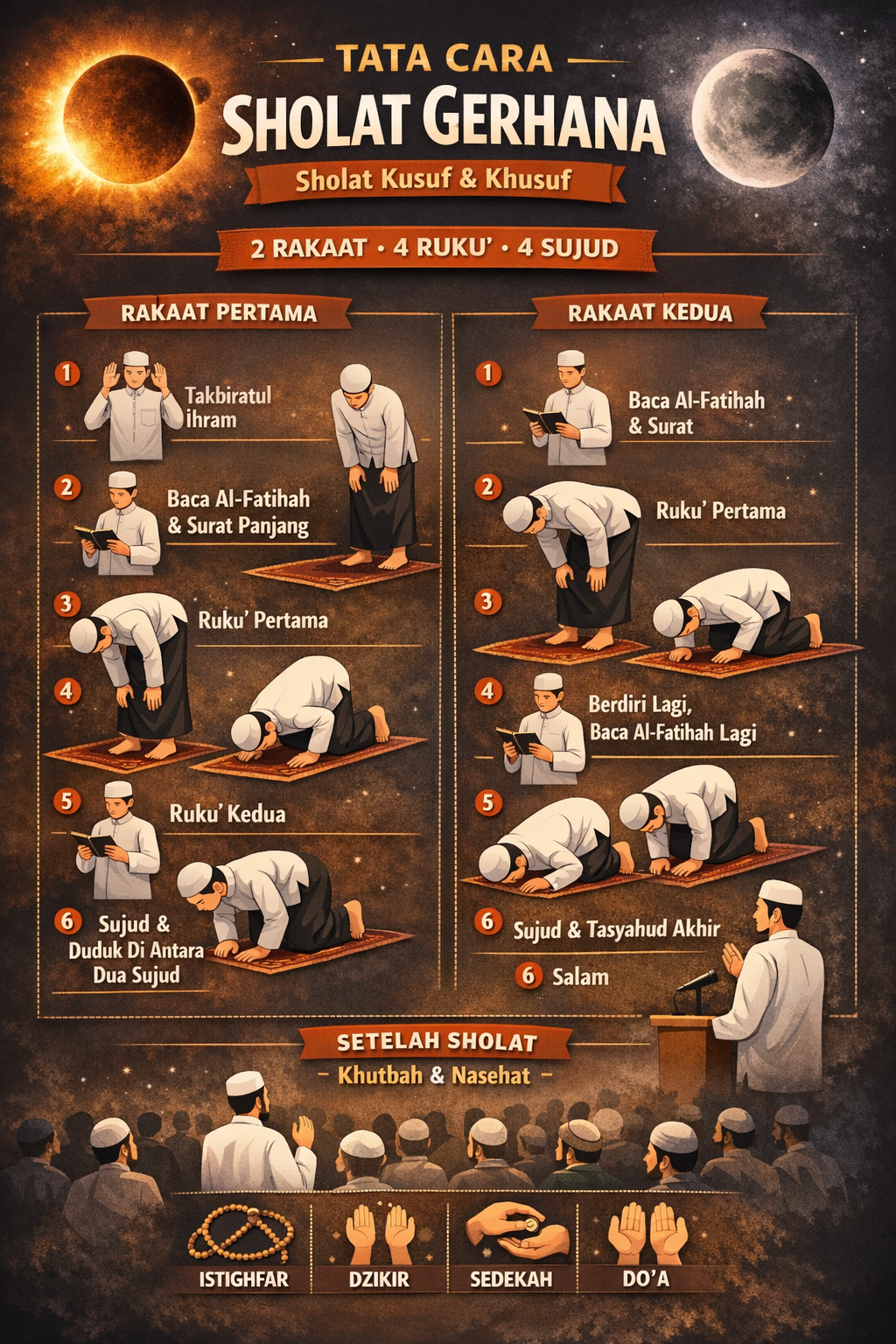 Berikut ini ringkasan detil tatacara shalat Gerhana:
