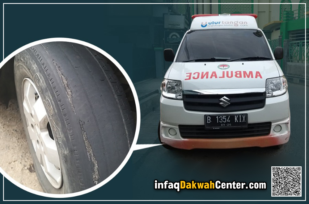 Padatnya aktivitas, memaksa Ambulans Peduli Umat merayap di atas aspal hampir 100 ribu kilometer, kini ban ambulans botak, aus dan retak. Bahkan ban depan sudah sobek terlihat seratnya.