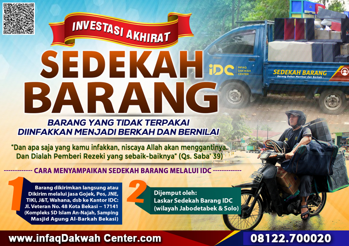 Infakkan saja melalui program Sedekah Barang IDC. Kami siap menerima dan menyalurkan kepada lembaga atau orang yang lebih membutuhkan. Barang anda kami sulap menjadi lebih bernilai, berkah dan manfaat untuk dakwah dan kemaslahatan umat Islam.
